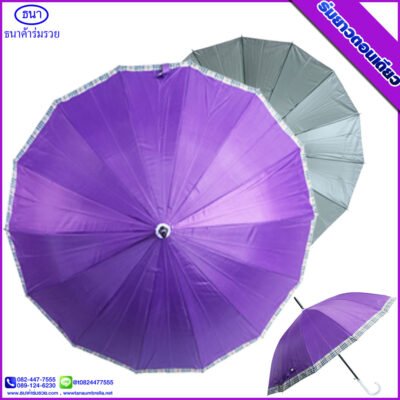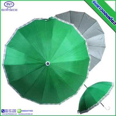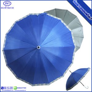 ร่มยาวตอนเดียว 14 ก้าน ขอบสก๊อต ขนาด 21 นิ้ว ยูวีสีเงิน มีโลโก้ ธนาค้าร่ม การันตีคุณภาพ ใช้กันแดด กันฝน ได้อย่างดีเยี่ยม ไม่ว่าจะใช้เป็นของชำร่วยงานศพ งานแต่ง งานบวช ของแจกพรีเมี่ยม