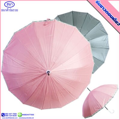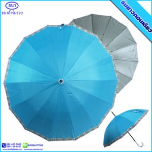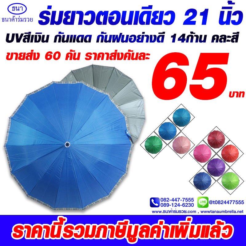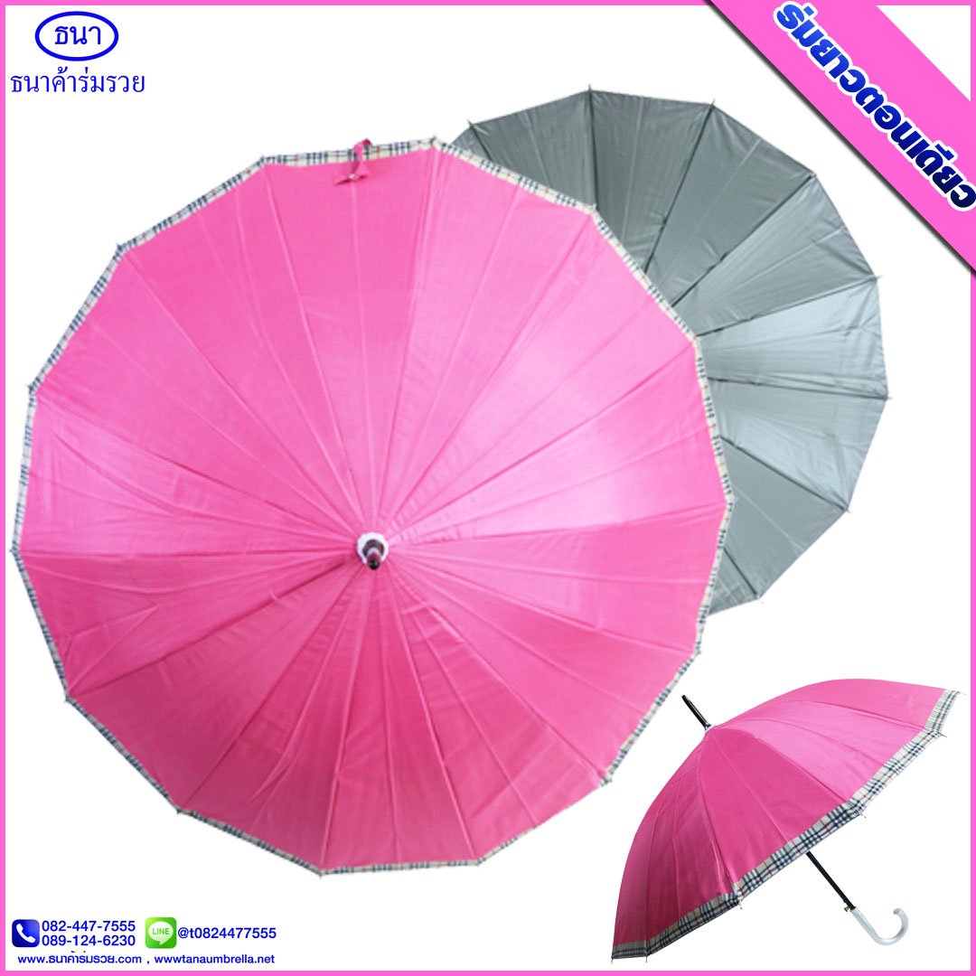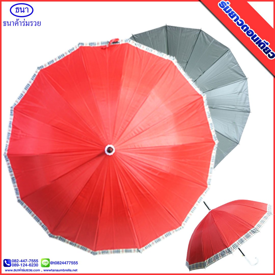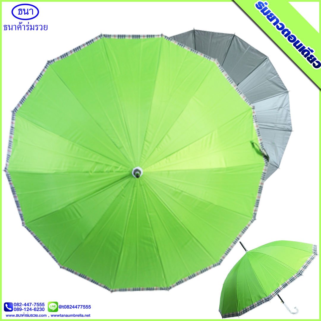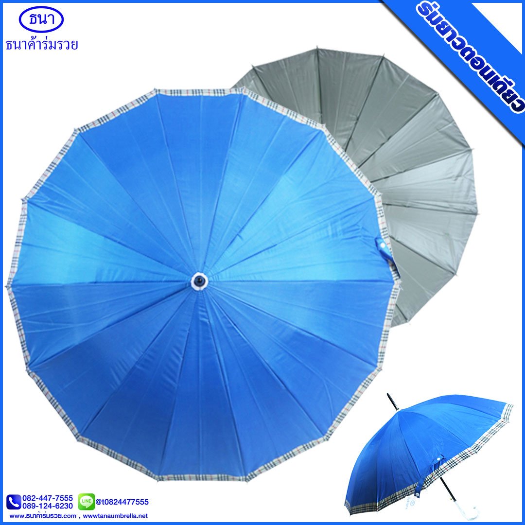 ร่มยาวตอนเดียว 14 ก้าน ขอบสก๊อต ขนาด 21 นิ้ว ยูวีสีเงิน มีโลโก้ ธนาค้าร่ม การันตีคุณภาพ ใช้กันแดด กันฝน ได้อย่างดีเยี่ยม ไม่ว่าจะใช้เป็นของชำร่วยงานศพ งานแต่ง งานบวช ของแจกพรีเมี่ยม ฯ