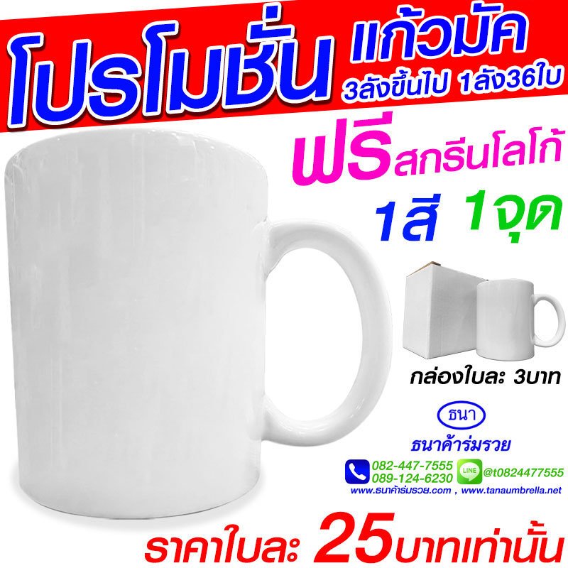 แก้วมัคเซรามิคสีขาว คุณภาพดี พร้อมสกรีนโลโก้ฟรี 1 สี 1 จุด ราคาพิเศษเพียงใบละ 25 บาท เหมาะสำหรับงานพรีเมี่ยม ของที่ระลึก โลโก้โดดเด่นชัดเจนบนพื้นสีขาว มีกล่องบรรจุสินค้า